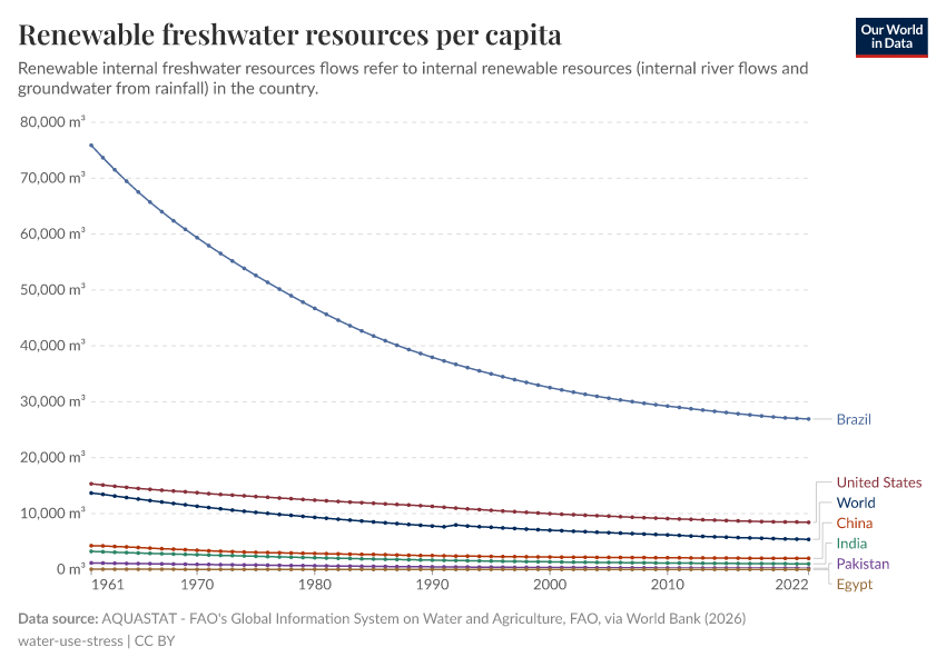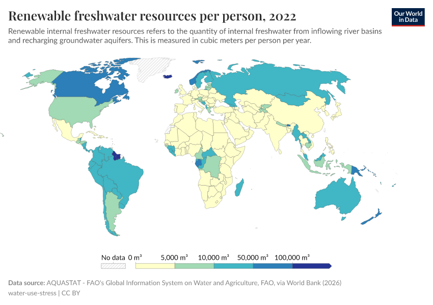 Renewable internal flows are, therefore, an important indicator of water security or scarcity. If rates of freshwater withdrawal begin to exceed the renewable flows, resources begin to decline. The chart shows the level of renewable internal freshwater resources per capita.