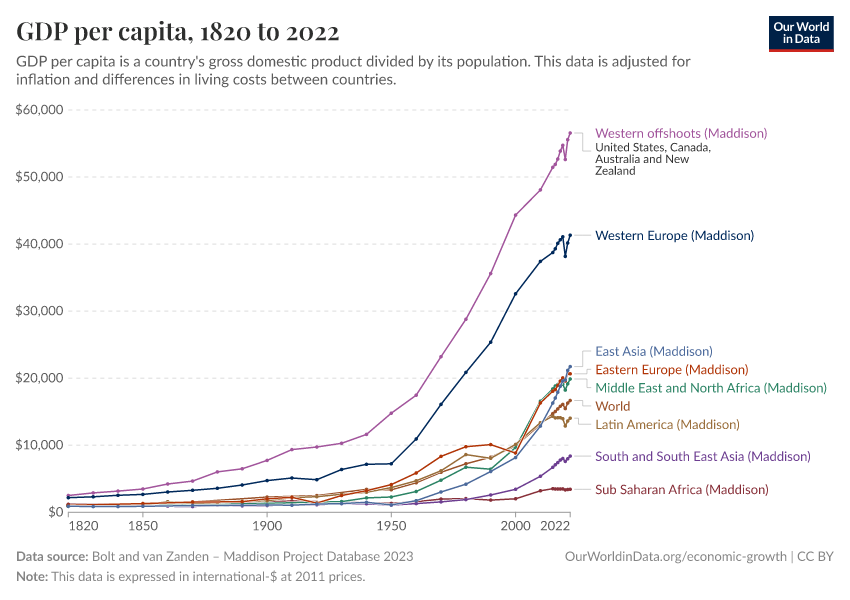 Jutta Bolt and Jan Luiten van Zanden (2021) — The GDP data in the chart is taken from The Long View on Economic Growth: New Estimates of GDP, How Was Life? Volume II: New Perspectives on Well-being and Global Inequality since 1820, OECD Publishing, Paris, https://doi.org/10.1787/3d96efc5-en.