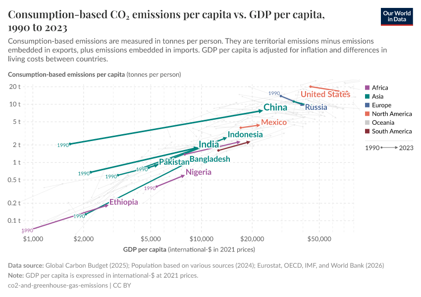 By default the chart shows the change of income and emission for the 14 countries that are home to more than 100 million people, but you can add other countries to the chart.