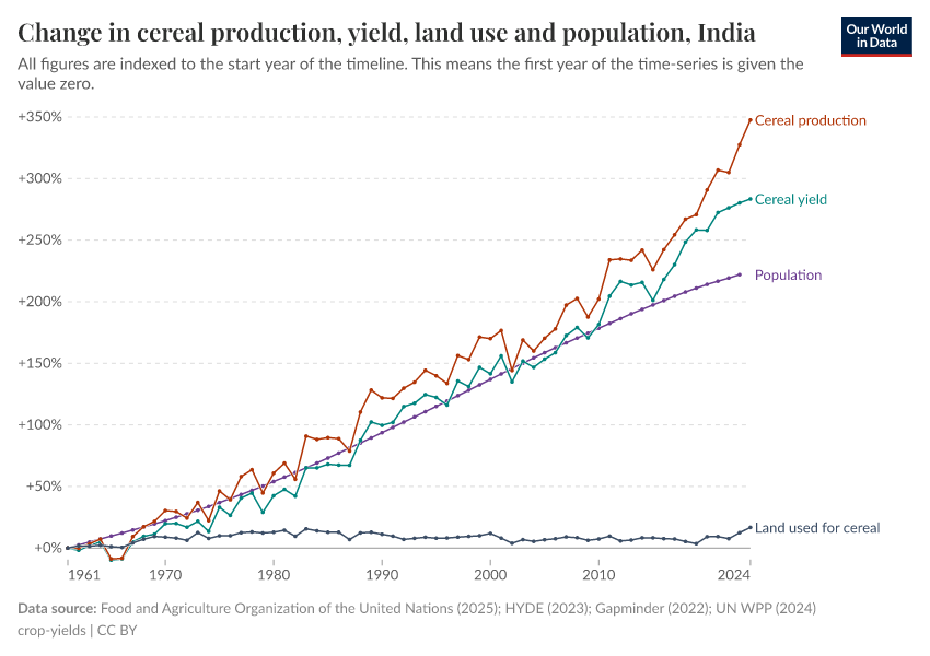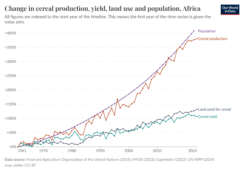 In the chart below we have mapped four variables: total cereal production; average cereal yield; land area used for cereal production; and total population. These are measured as an index relative to their respective values in 1961 (i.e. 1961 is equal to 0).