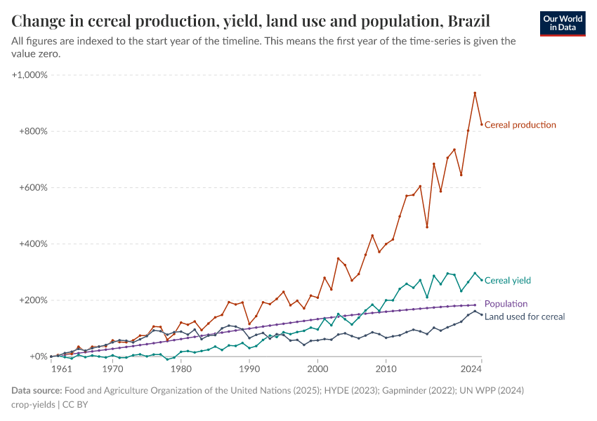 Brazil’s cereal production has increased dramatically since 1961, far exceeding its population increase.