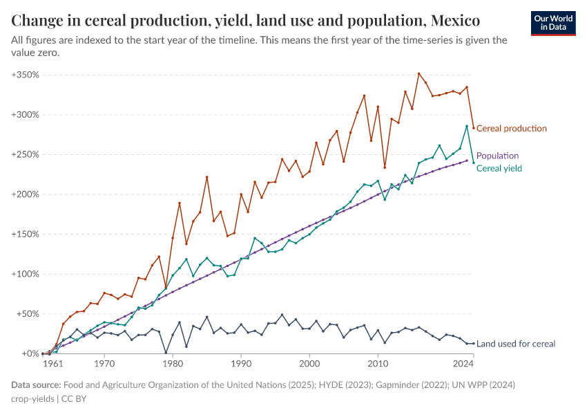 In the chart below we see cereal production, land use and yield trends for Mexico over the period from 1961. Mexico was one of the first countries to be linked to the Green Revolution of the 20th century.1